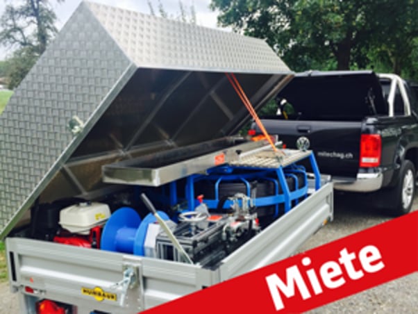 Le chariot à tiges peut être loué pour une seule journée ou pour une période plus longue. Inclus : Chariot à tiges sur remorque, sonde tire fils de 400 m, raccord initial de tuyau avec 2x 3 m de tubes de direction et manchons, treuil à câble jusqu'à 1000 kg de force de traction, boîte à outils, bidon d'essence plein, divers embouts pour sonde tire fils, signal pliable "Attention chantier".